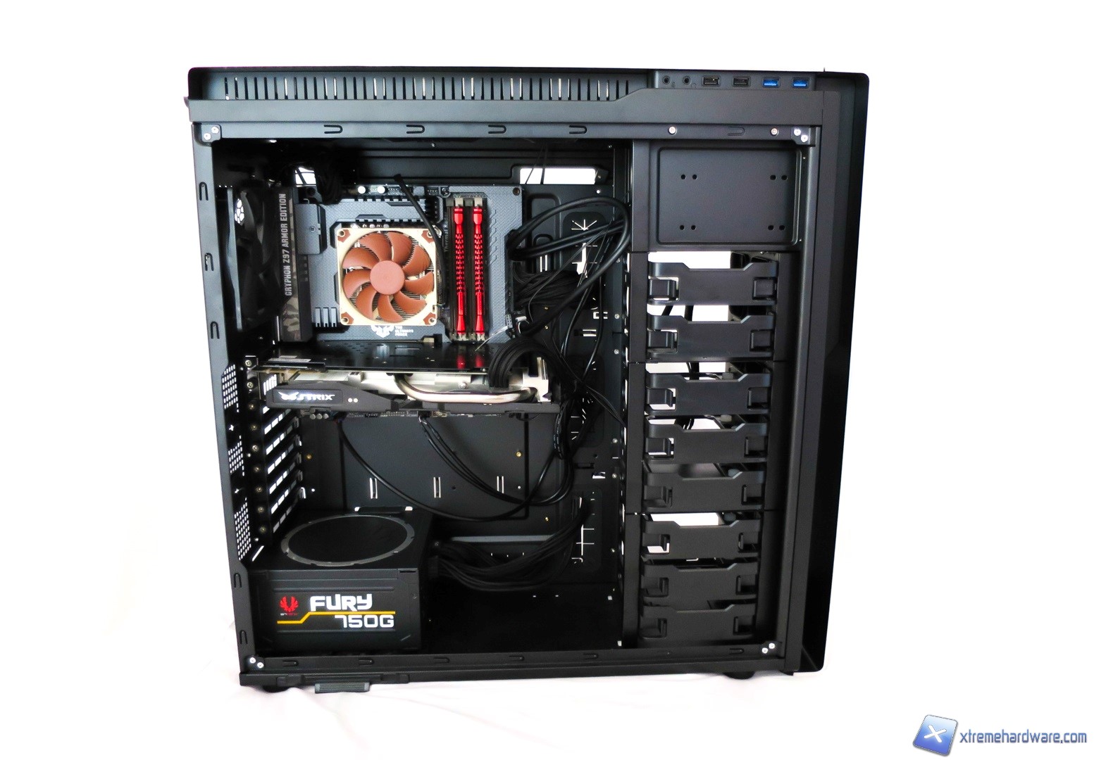 Se si possiede un dissipatore Intel, tramite il solito sistema Push-Pin o un dissipatore aftermarket o AIO potremo installarlo senza problemi anche dopo grazie al generoso foro nel tray della scheda madre. Dopo aver montato il dissipatore sulla scheda madre, sarà necessario montare la scheda video, le RAM ed infine procedere all’assemblaggio dei cavi di connessione del cabinet alla scheda madre. Essendo un case Full Tower e dotato di spazio a volontà potremo organizzare i cavi dopo aver installato i componenti e farli passare attraverso i fori disponibili.