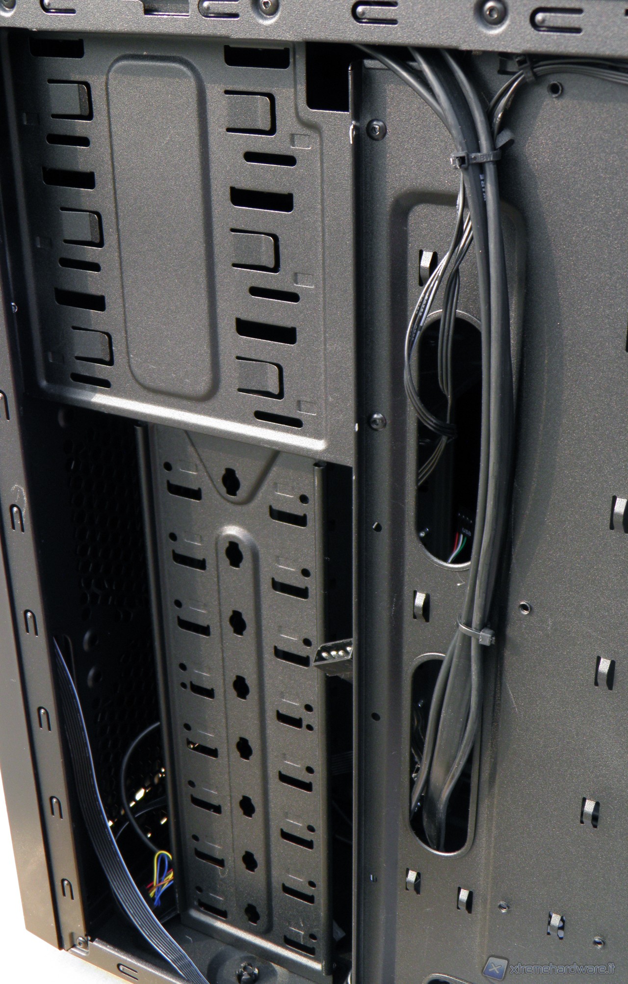 Sul fondo infine, diversi fori opportunamente levigati creano il passaggio per i cavi dalla parte posteriore a quella anteriore, garantendo la possibilità di effettuare un buon cable management. Lo spazio tra la lamiera di supporto della scheda madre e la paratia del case è di circa 15mm.