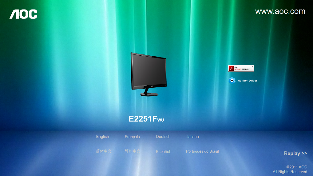 L’installazione guidata e documentata sul manuale, risulta molto rapida ed è necessario effettuarla prima della connessione fisica del monitor al PC. Inserendo il CD nel lettore ottico si avvierà dapprima una presentazione dell’azienda AOC con le tipologie dei monitor che l’azienda offre a catalogo. Successivamente, sarà possibile consultare il manuale in italiano e procedere all’installazione dei driver, cliccando su Monitor Driver, durante il quale lo schermo predefinito lampeggerà più volte. Alla conclusione, la finestra dell’installazione si chiuderà automaticamente non rilasciando alcun avviso. Sarà ora possibile collegare il monitor al PC e lasciar completare l’operazione di riconoscimento; potrebbe venir richiesto il riavvio del sistema alla fine dell’installazione.