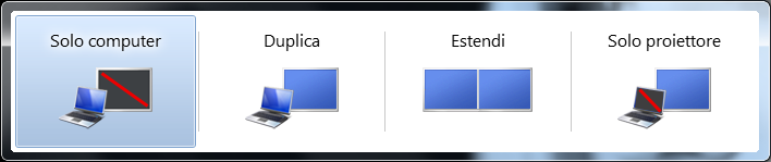 Con sistema operativo Windows 7, tramite la combinazione di tasti Win+P, si aprirà un rapido menù che ci darà la possibilità di scegliere l’unico dispositivo video (Solo computer, Solo proiettore), riprodurre su entrambi gli schermi la stessa immagine (Duplica) od affiancare la visuale al monitor predefinito (Estendi).