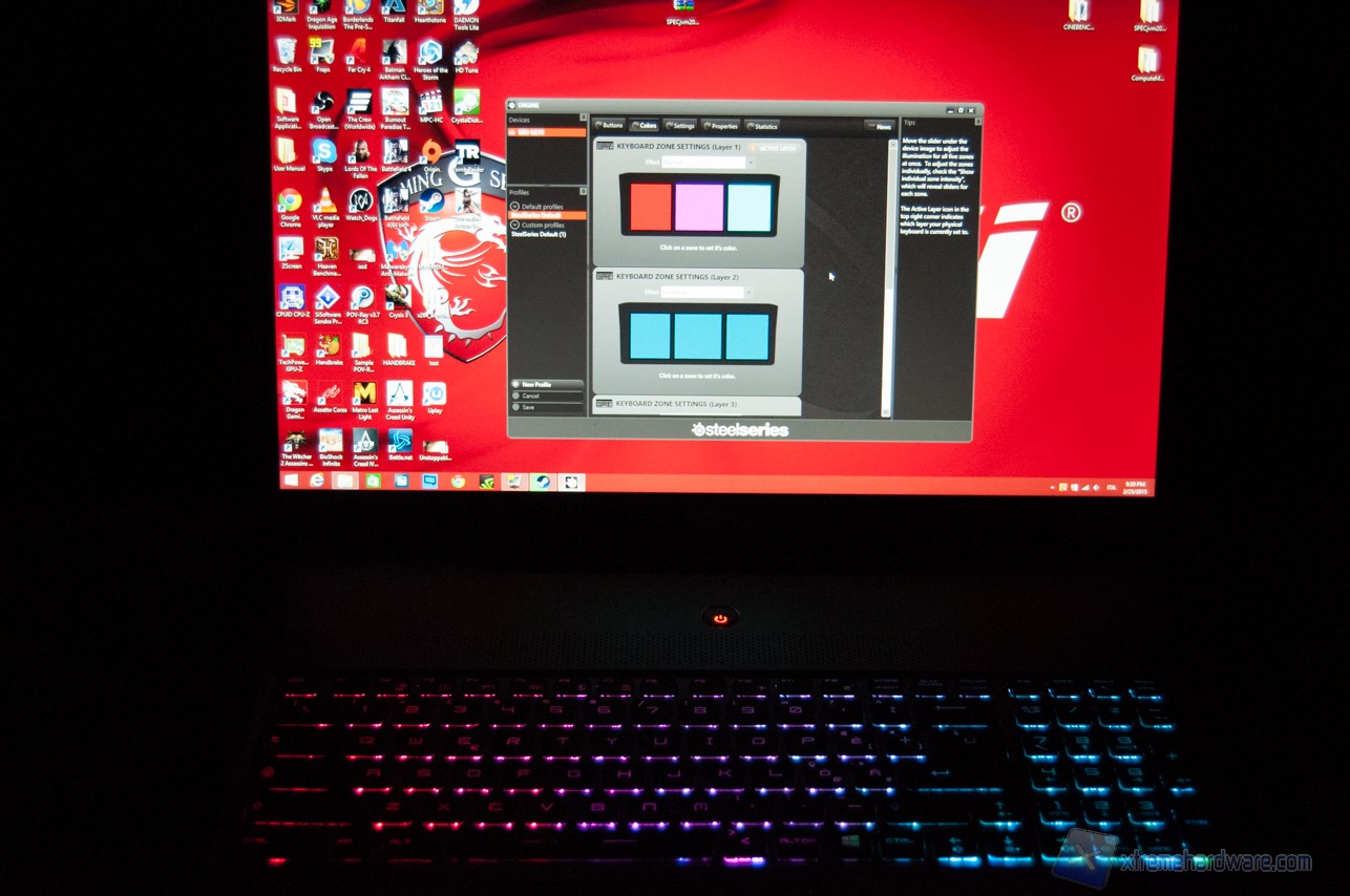 Grazie al software integrato e sviluppato da Steelseries, infatti, possiamo scegliere quale colore impostare alla zona di retroilluminazione, se attivare l'illuminazione a "onda", se far cambiare colore progressivamente alla retroilluminazione ecc. Salvando, il PC cambierà immediatamente aspetto.