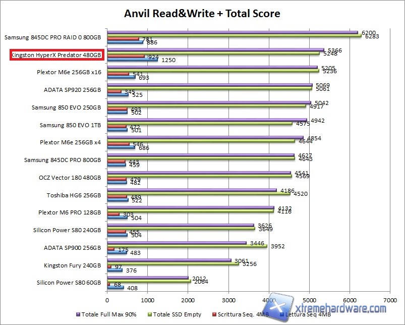 Se con AS SSD trovavamo il Predator ancora dietro il Plextor qui la situazione cambia a favore dell'HyperX che si posiziona tra le prime posizioni ma ancora indietro seppur non di molto rispetto al RAID di Samsung 845DC PRO.