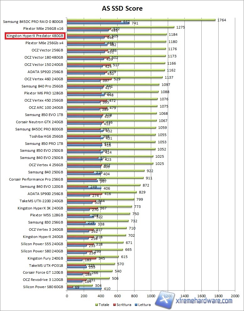 Con AS SSD notiamo valori ottimali ma non abbastanza da competere almeno in questo caso con il precedente Plextor M6e seppur il gap è davvero minimo. Il RAID di Samsung 845DC PRO agilmente battuto negli altri test qui non viene smosso dalla prima posizione. Rircordiamo che in questo caso l'HyperX Predator è stato testato sullo slot PCIe 2.0 x4 collegato al chipset Z97, quindi possiamo aspettarci un considerevole miglioramento installandolo su uno slot PCIe 3.0 x16, come mostrato nel test CDM.